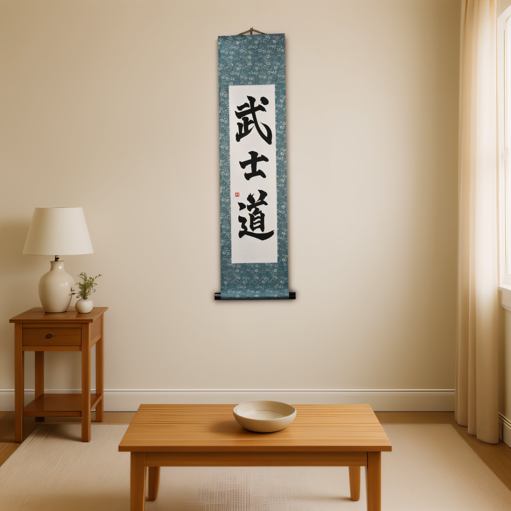 his calligraphy scroll features the powerful word 武士道 (Bushidō), which embodies the way of the Samurai.