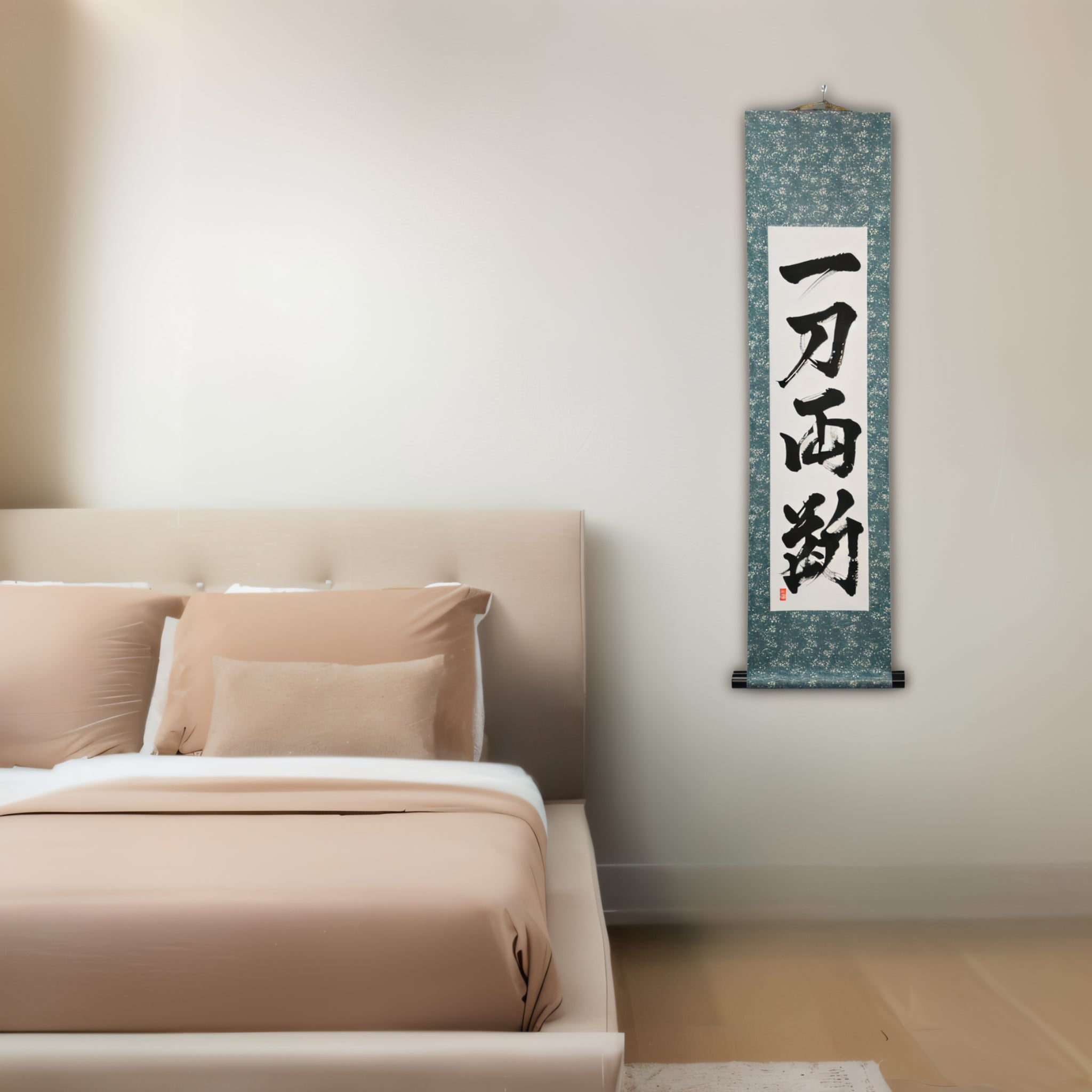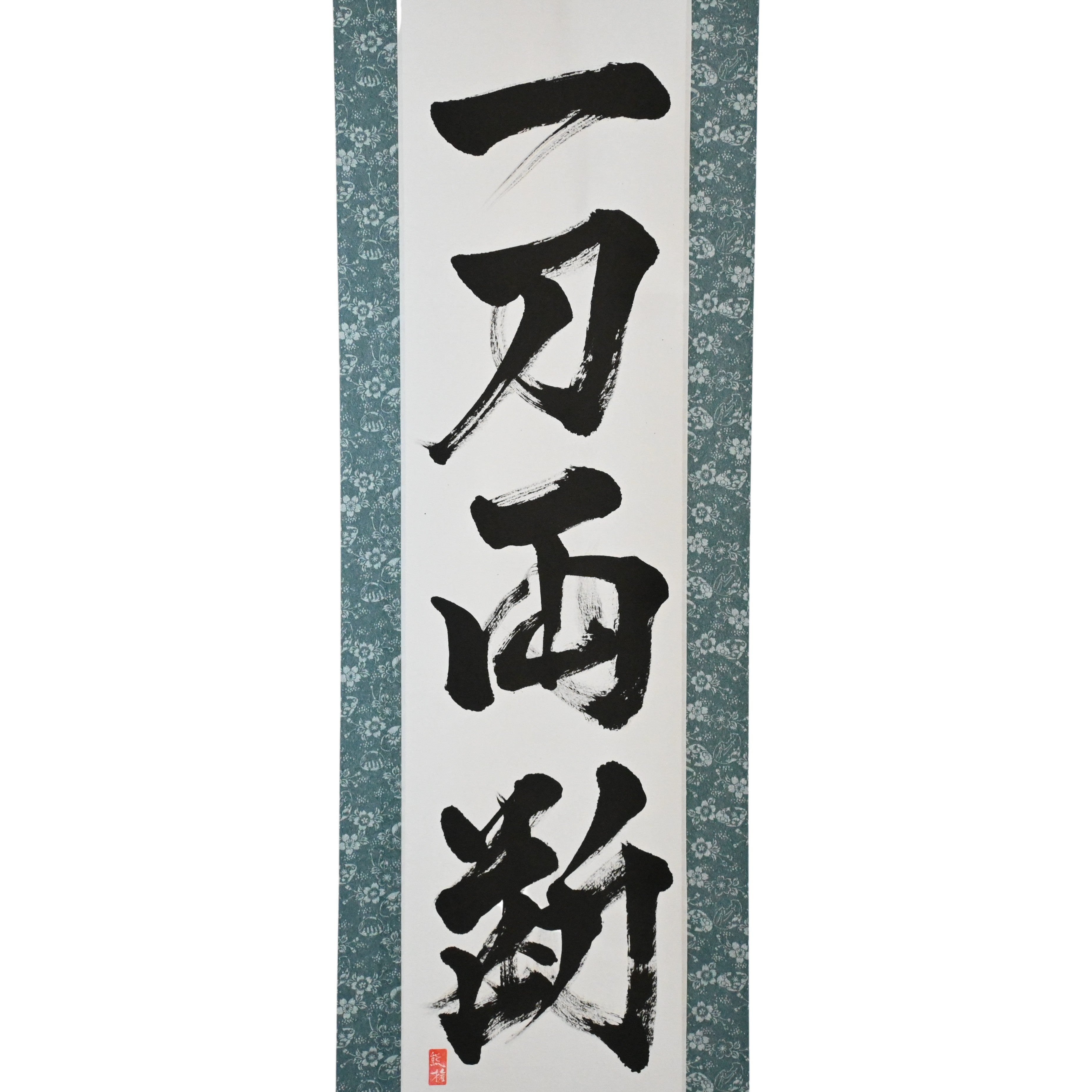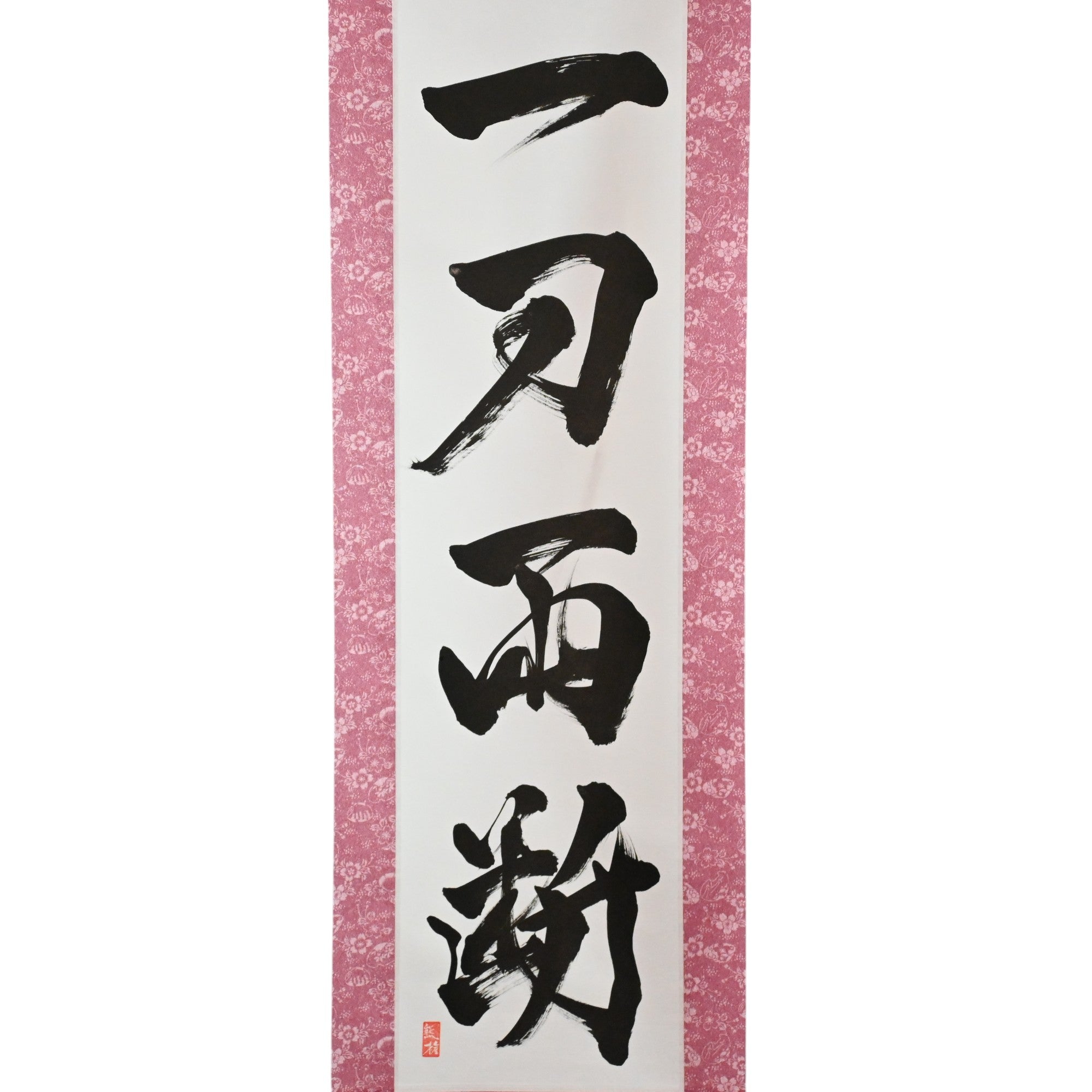 This Japanese calligraphy scroll boldly displays the phrase 一刀両断 (Ittō Ryōdan) — a powerful expression that captures the unwavering decisiveness and clarity of the samurai spirit.