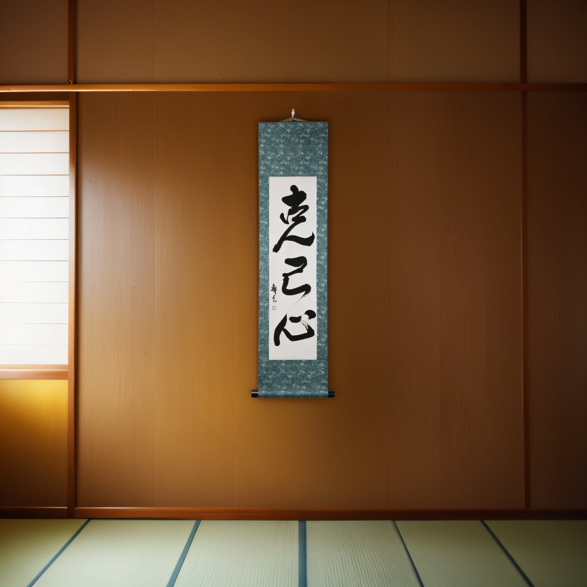 This Japanese calligraphy scroll features the powerful term 克己心 (Kokkishin), meaning "the spirit of self-mastery". It represents a universal principle across Karate, Judo, and Aikido — the idea that the greatest opponent is often within.