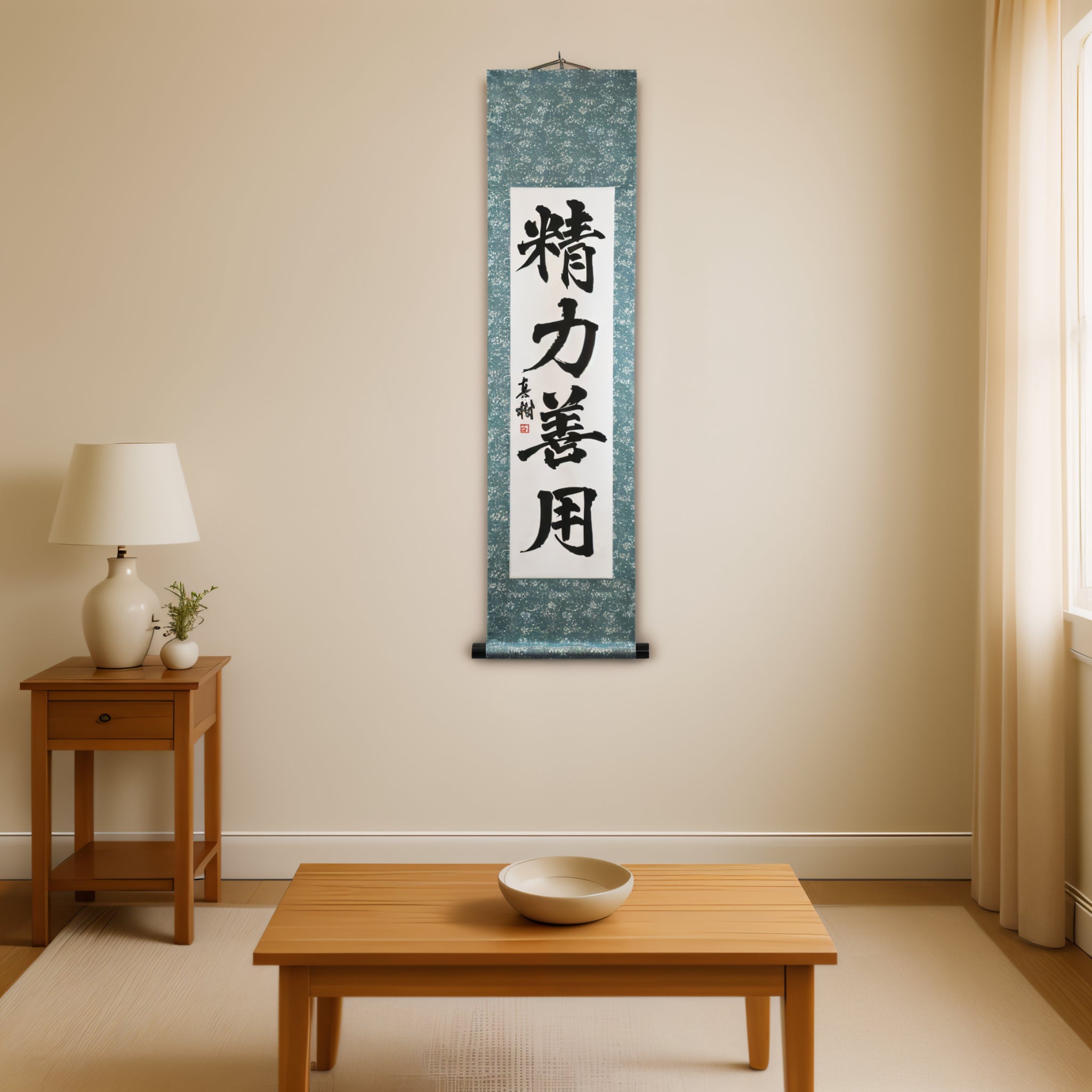 This Japanese calligraphy scroll features the timeless phrase 精力善用 (Seiryoku-Zenyō) — translated as "Maximum Efficient Use of Energy". It is one of the two core principles of Judo, alongside 自他共栄 (Jita-Kyōei, "Mutual Welfare and Benefit"), both established by Judo’s founder, Jigoro Kano (嘉納治五郎).